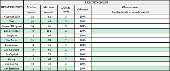 En la superficie total del área de estudio, centro norte santafesino, constituida por los departamentos Nueve de Julio, Vera, General Obligado, San Cristóbal, San Justo, San Javier, Garay, Castellanos, Las Colonias, La Capital, San Martín y San Jerónimo, como consecuencia de las precipitaciones ocurridas en las últimas dos semanas de octubre, se produjo una paulatina recuperación del agua útil en los perfiles de los suelos y se detectó disponibilidad para la etapa de siembra de diferentes cultivos de la campaña, en toda el área del SEA.