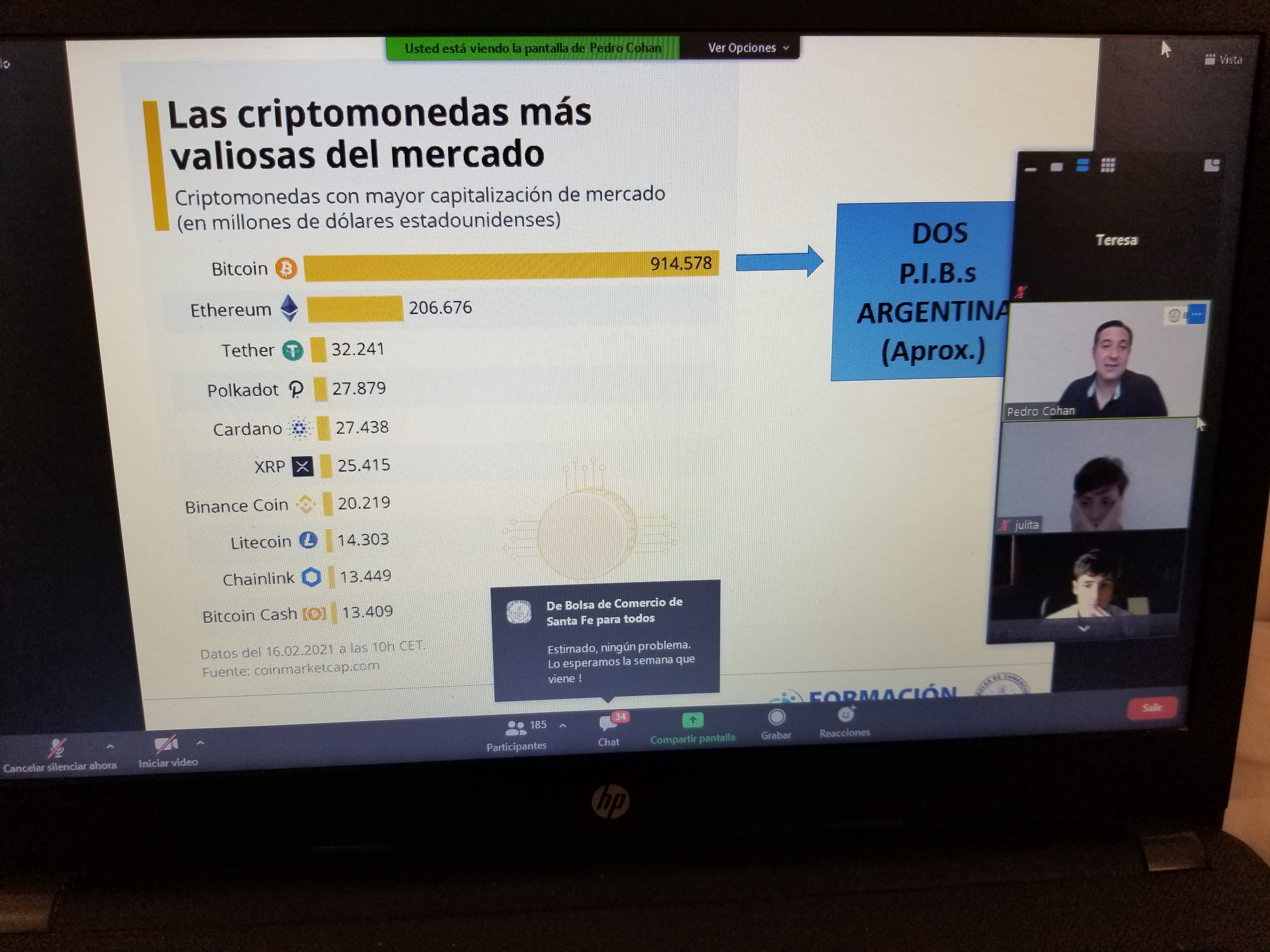 Entre otra información suministrada sobre las criptos, el Mg. Cohan aclaró que las cotizaciones son libres, depende de la oferta y la demanda de los grandes tenedores y explicó en forma didáctica cómo se genera la estructura de oferta, según la criptomoneda elegida.