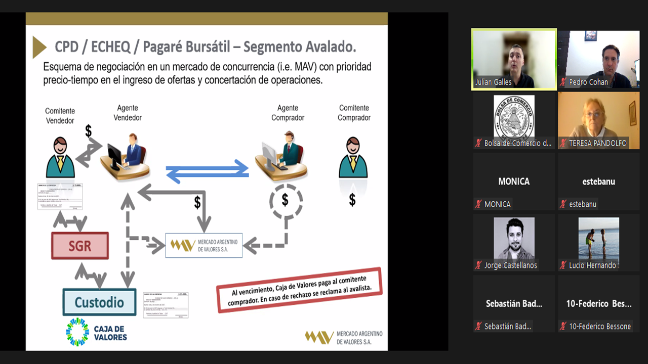 Organizada por la Bolsa de Comercio de Santa Fe y el Mercado Argentino de Valores, tuvo lugar en forma remota, una charla sobre el tema: ¿Cómo financiarse emitiendo pagarés bursátiles? Estuvo a cargo del Lic. Julián Galles especialista en mercados, quien fue presentado por el coordinador del Centro de Estudios y Servicios, Mg. Pedro Cohan