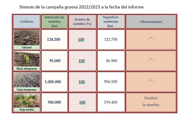 Por las precipitaciones semanales, el sector productivo activó el movimiento de equipos o sembradoras un par de días, aprovechó así, el agua útil disponible en la cama de siembra, que, con el aumento de las temperaturas y el ambiente muy seco, disminuyó. Con dicho paisaje, finalizó la siembra de la campaña 2022/2023.